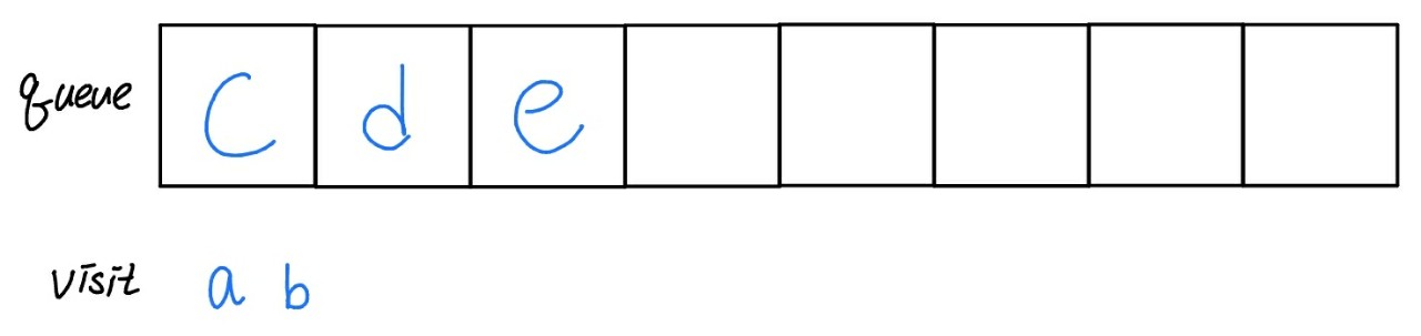 b와 인접한 정점인 d와 e가 queue에 push된다. 하지만 c의 순서가 먼저이기 때문에 다음 탐색 순서는 c가 된다.