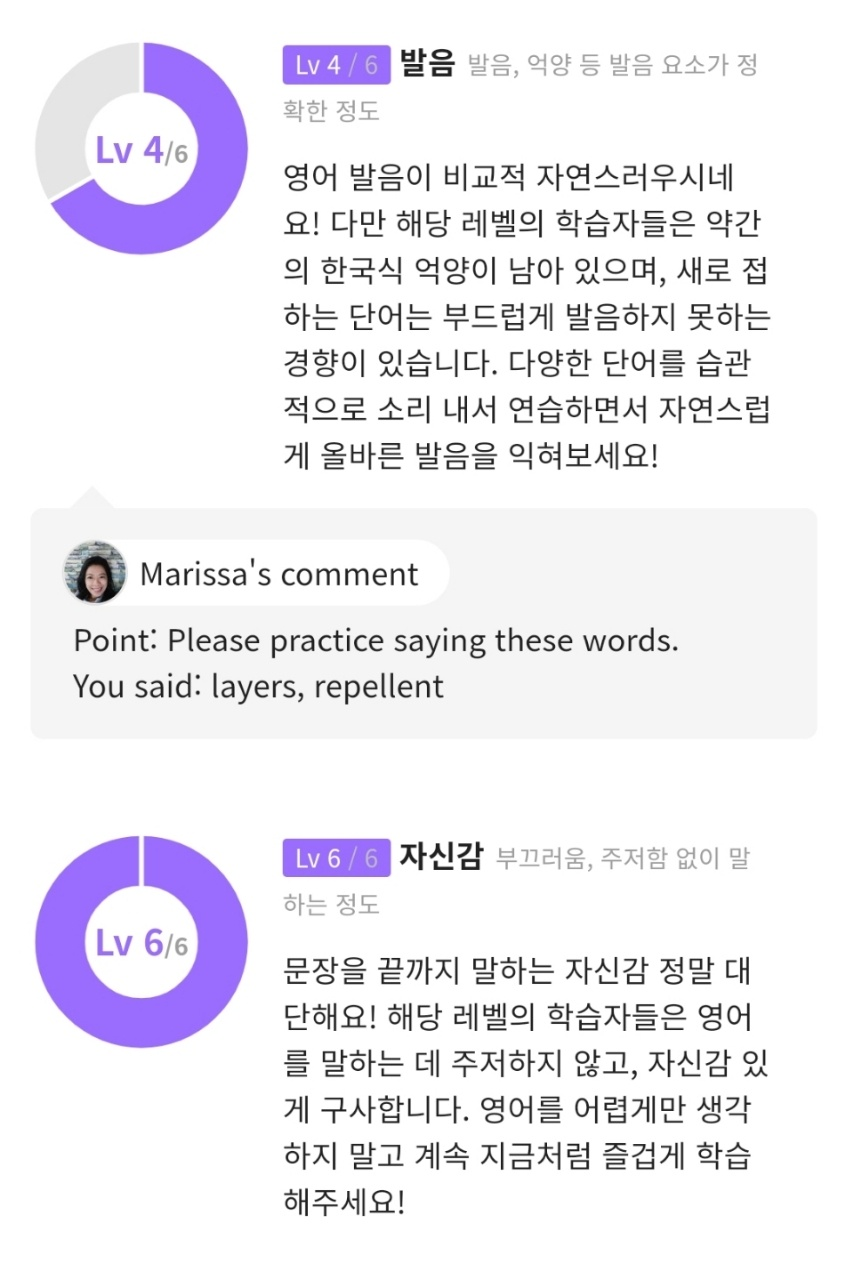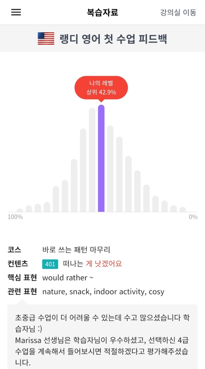 할튼 첫 수업 끝나면 이렇게 실력 백분위 나온다.. 그 밑으로 선생님의 개인적인 평가들과 녹음 파일들이 있다.