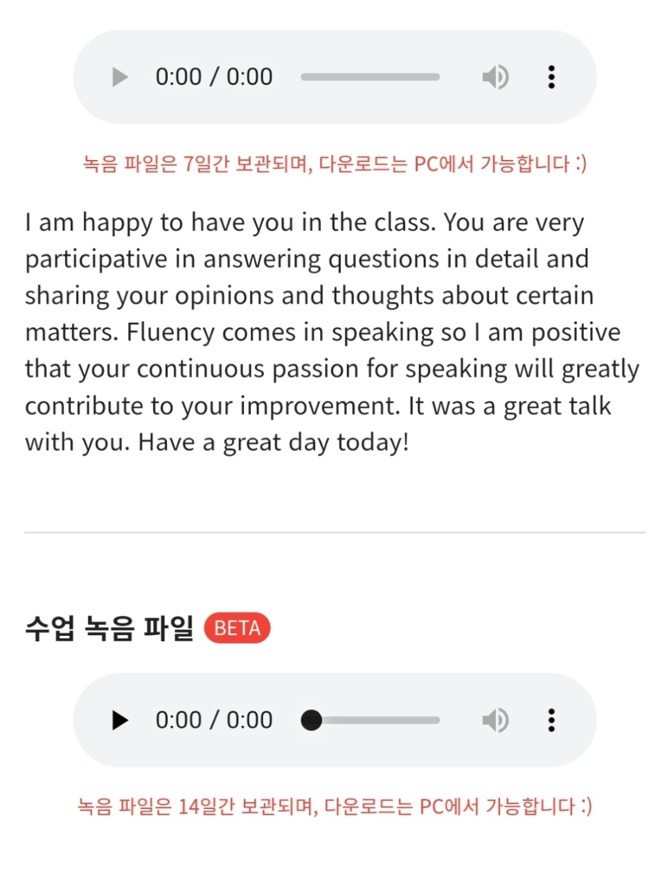 위의 녹음파일은 선생님의 평가가 담겨있다.. 좋은 말들 많이 해주시고 좀 중요하게 고쳐야 하는 것들 다시 집어서 알려주신다.