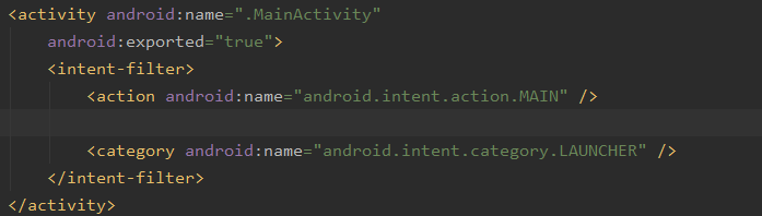 마지막으로 AndroidManifest.xml 파일에서 수정할 부분이 있다. MainActivity에 대해서 intent-filter가 설정되어 있는데, 안드로이드 버전 12, 즉 sdk 31버전부터는 intent-filter를 사용할 때 추가적으로 설정해야할 것이 생겼다. 아래와 같이 <activity 단에